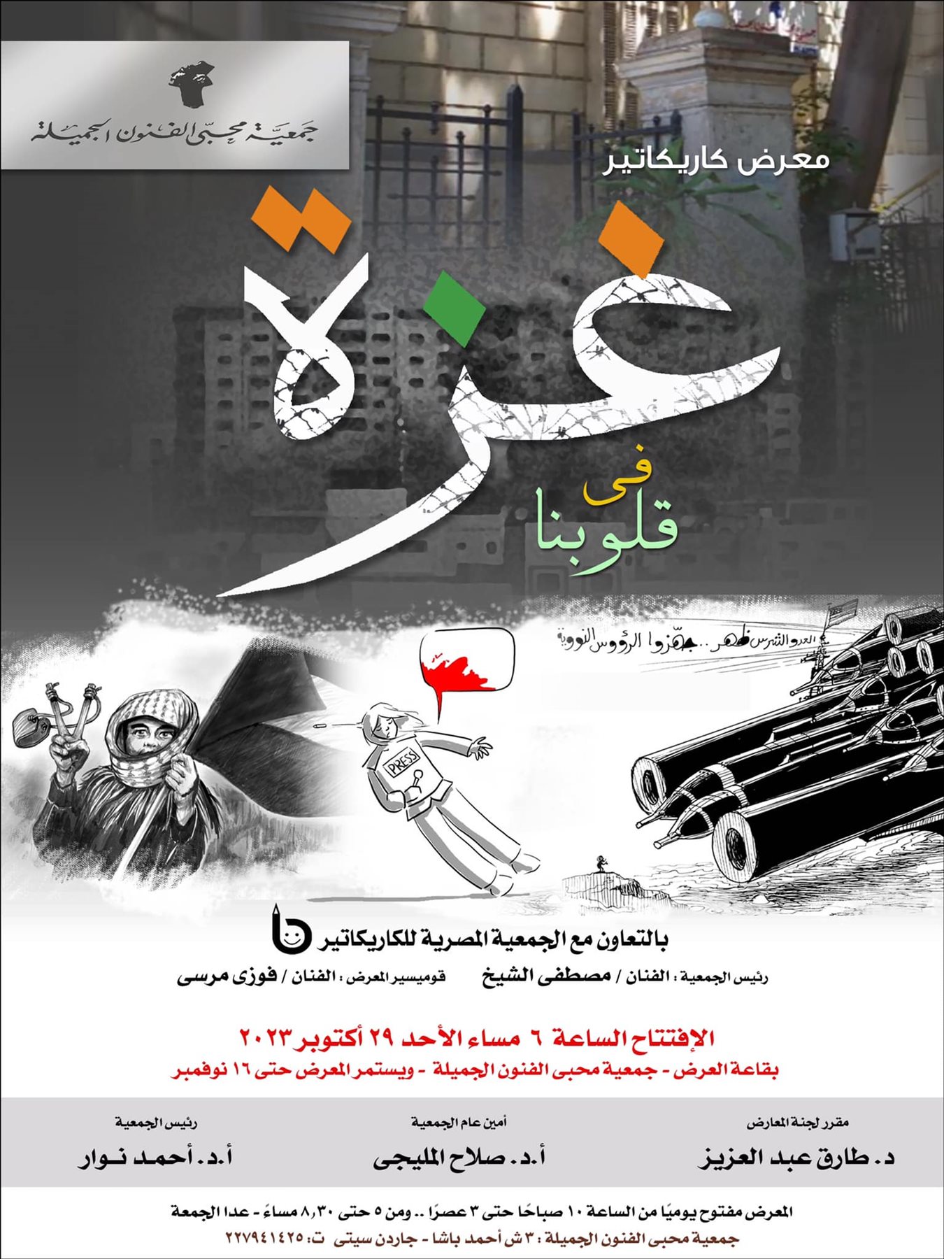 تطلق جمعية محبى الفنون الجميلة معرضًا لفن الكاريكاتير بعنوان: (غزة في قلوبنا) بالتعاون مع الجمعية المصرية للكاريكاتير، وذلك فى السادسة مساء اليوم الأحد الموافق 29 أكتوبر 2023.