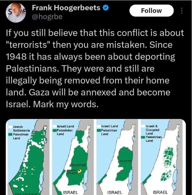 تضمن المنشور الذي وضعه فرانك هوجربيتس على صفحته، صورة لخريطة فلسطين توضح مدى انتشار بقعة الاستعمار الإسرائيلي وهيمنته على الدولة منذ عام 1947 حتى عام 2005.
