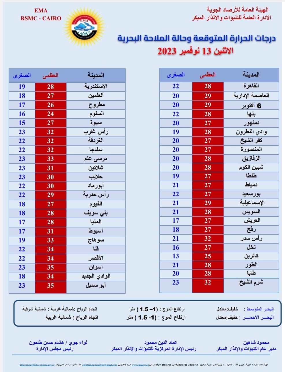 وفيما يلي بيان بدرجات الحرارة المتوقعة اليوم الاثنين على محافظات ومدن مصر: