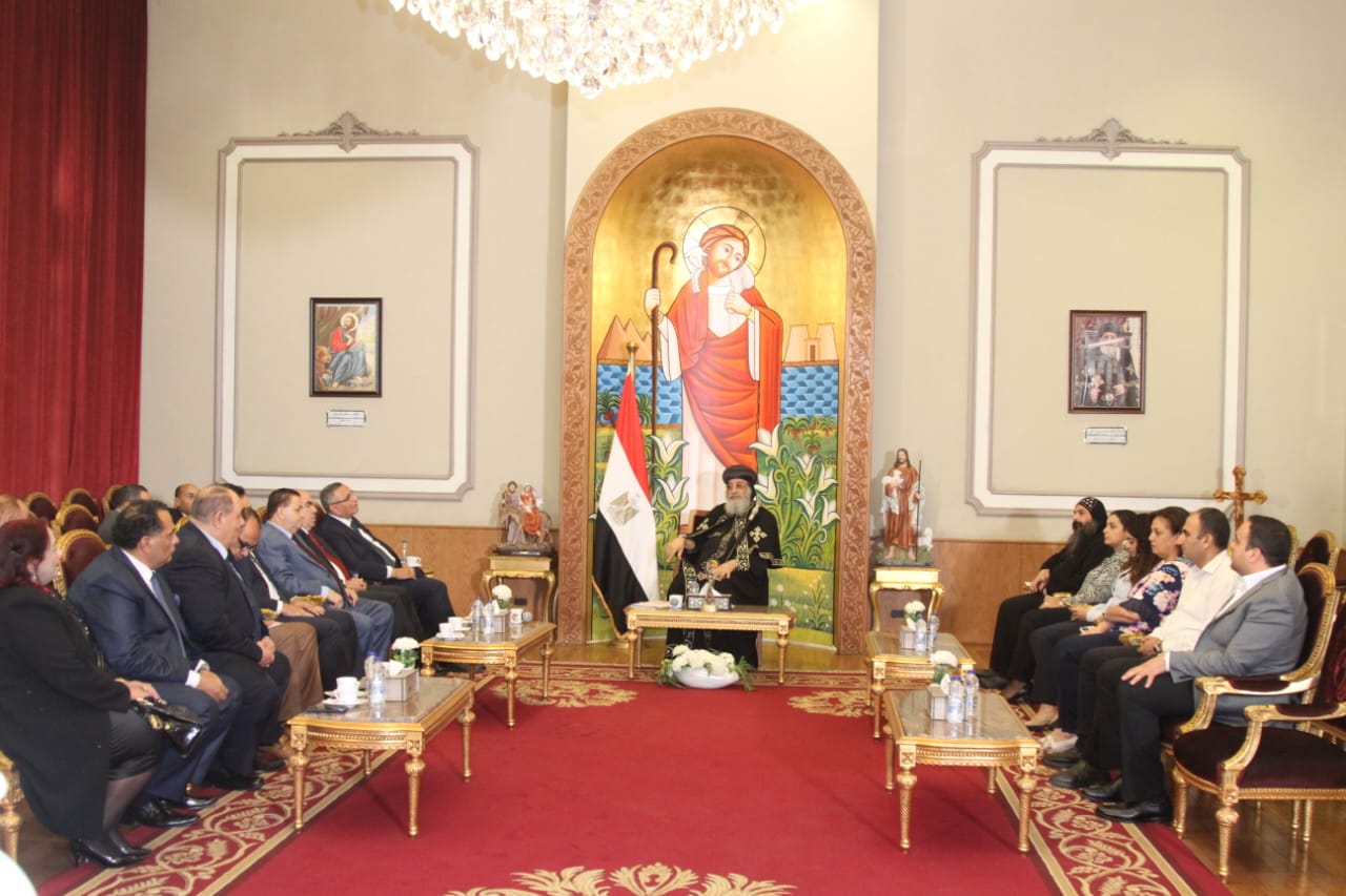 ورحب البابا تواضروس بالدكتور عبدالسند يمامة، والوفد المرافق له على أرض الكاتدرائية.