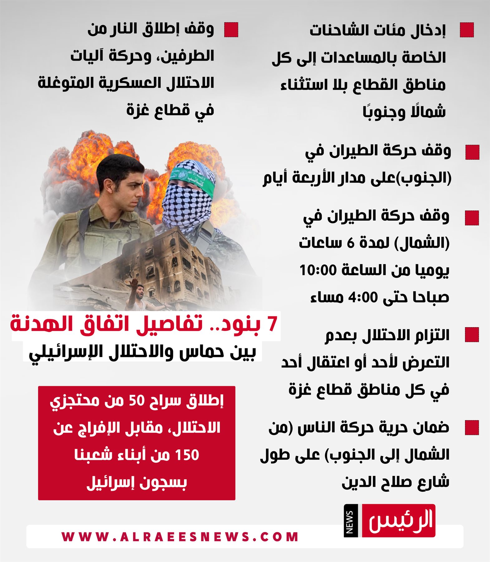 وفي سياق متصل، كشفت حركة حماس الفلسطينية في بيان صحفي، فجر الأربعاء، عن تفاصيل اتفاق صفقة تبادل الأسرى وإعلان الهدنة في غزة مع الجانب الإسرائيلي بجهود مصرية قطرية، مؤكدة أن بنود الاتفاق تأتي وفق رؤية المقاومة ومحددتها التي تخدم الشعب الفلسطيني.