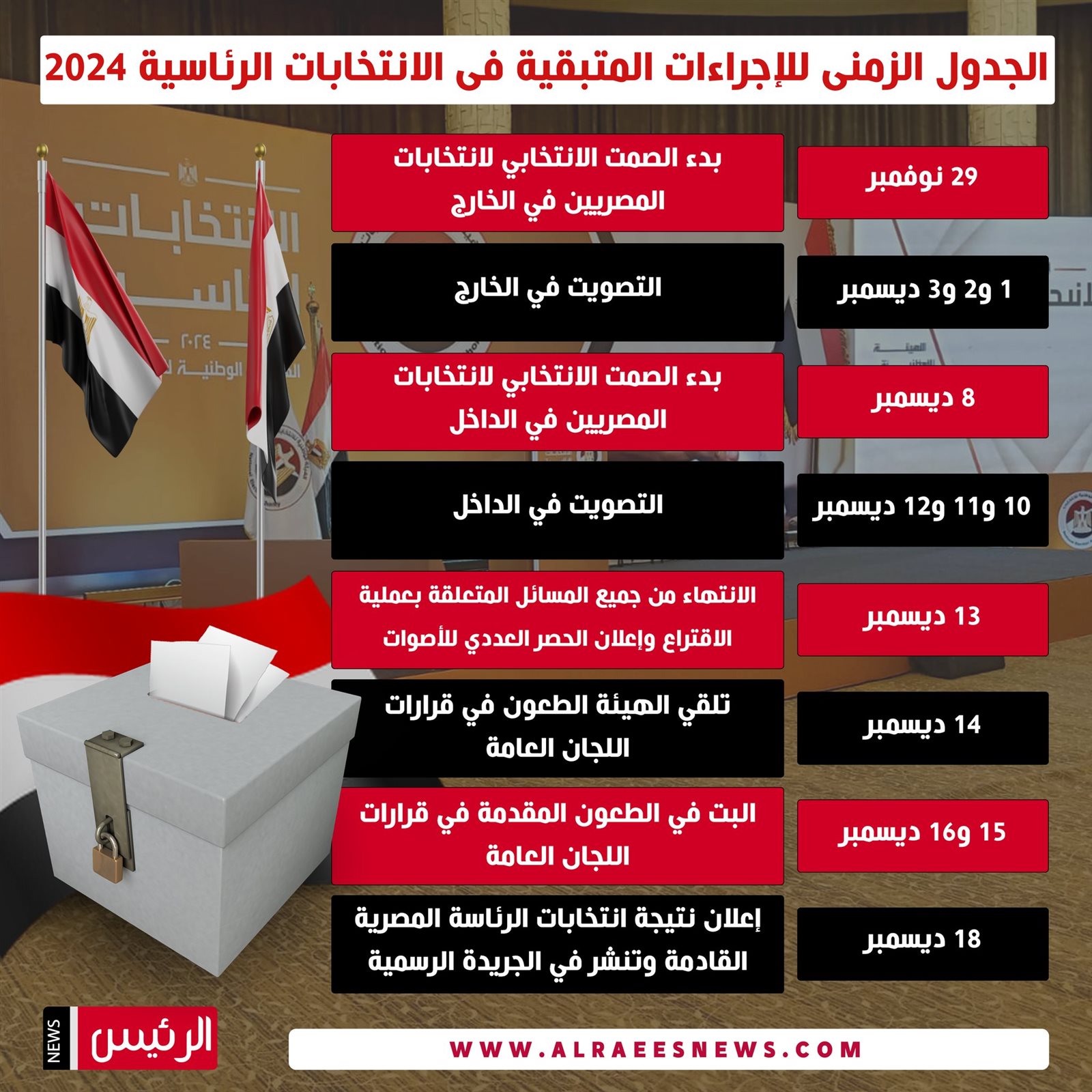 وفي السياق ذاته، يستعرض “الرئيس نيوز” الجدول الزمني للإجراءات المتبقية في الانتخابات الرئاسية 2024، وهي كالآتي: