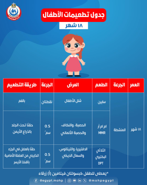 ومن جانبها، أوضحت وزارة الصحة والسكان، أن التطعيمات لها دور هام وفعال في مواجهة الأمراض المعدية وغير المعدية وتعزيز الجهاز المناعي لجسم الطفل، حيث أنه لا بد من التواصل مع الوحدة الصحية التابعة للطفل حال تخلفه عن الحصول على التطعميات بالمواعيد المحددة.