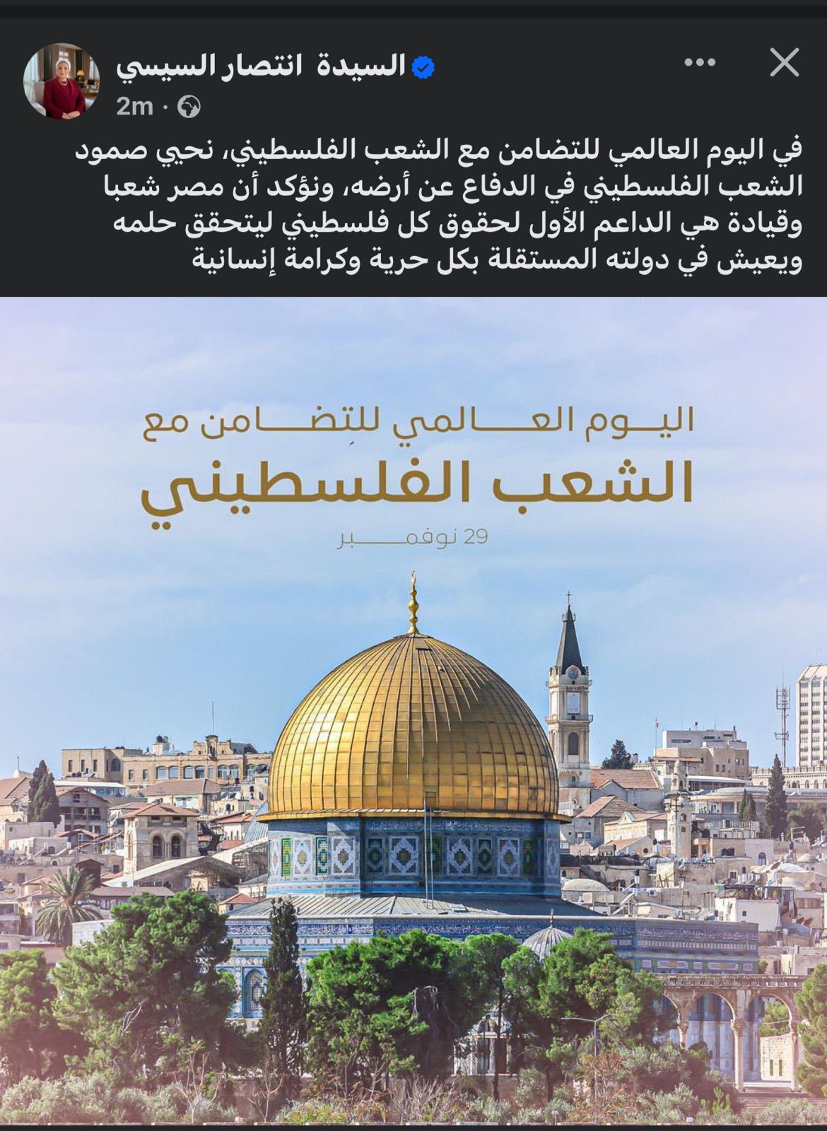 قالت السيدة انتصار السيسي قرينة رئيس الجمهورية إنه في اليوم العالمي للتضامن مع الشعب الفلسطيني، نحيي صمود الشعب الفلسطيني في الدفاع عن أرضه.