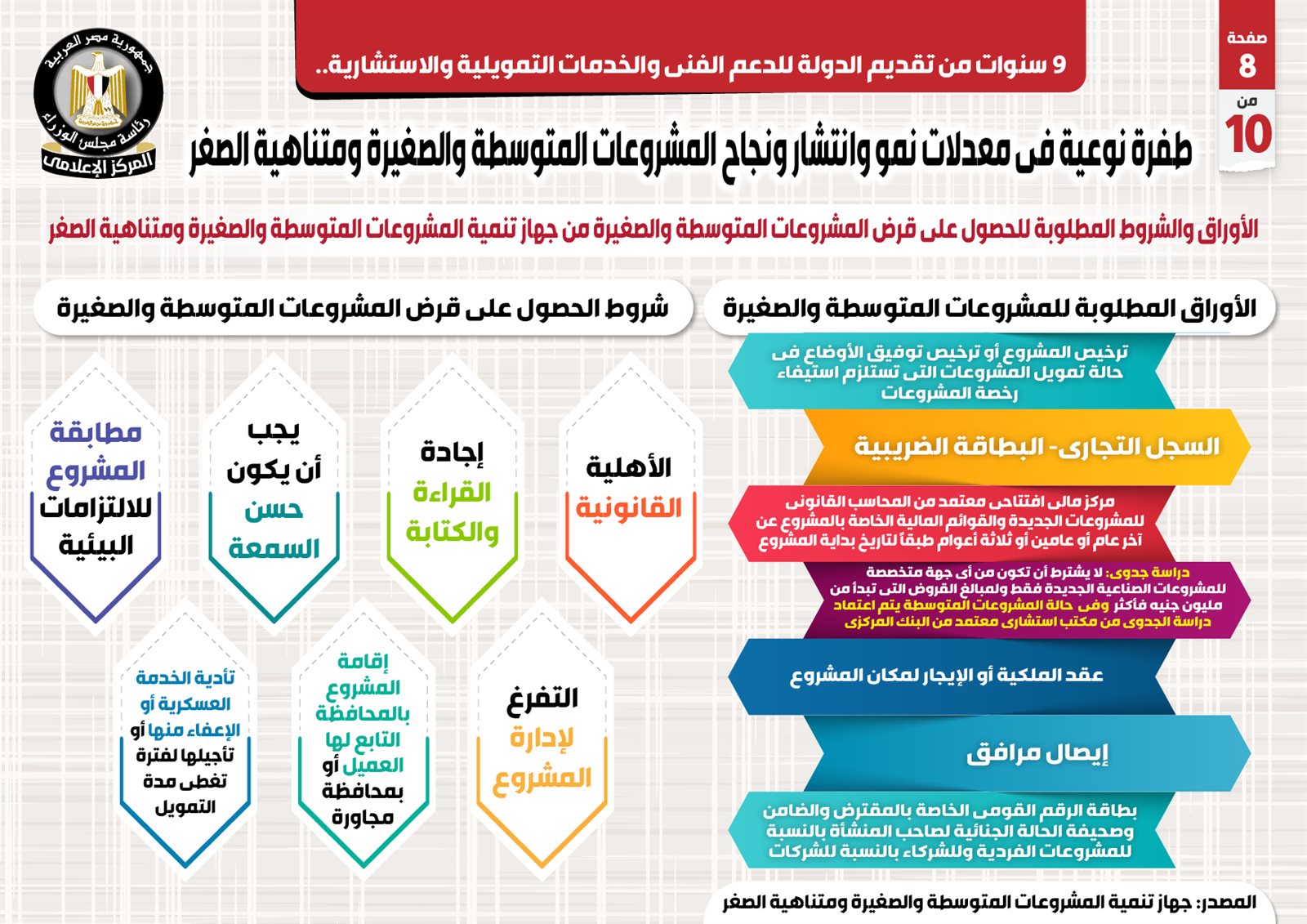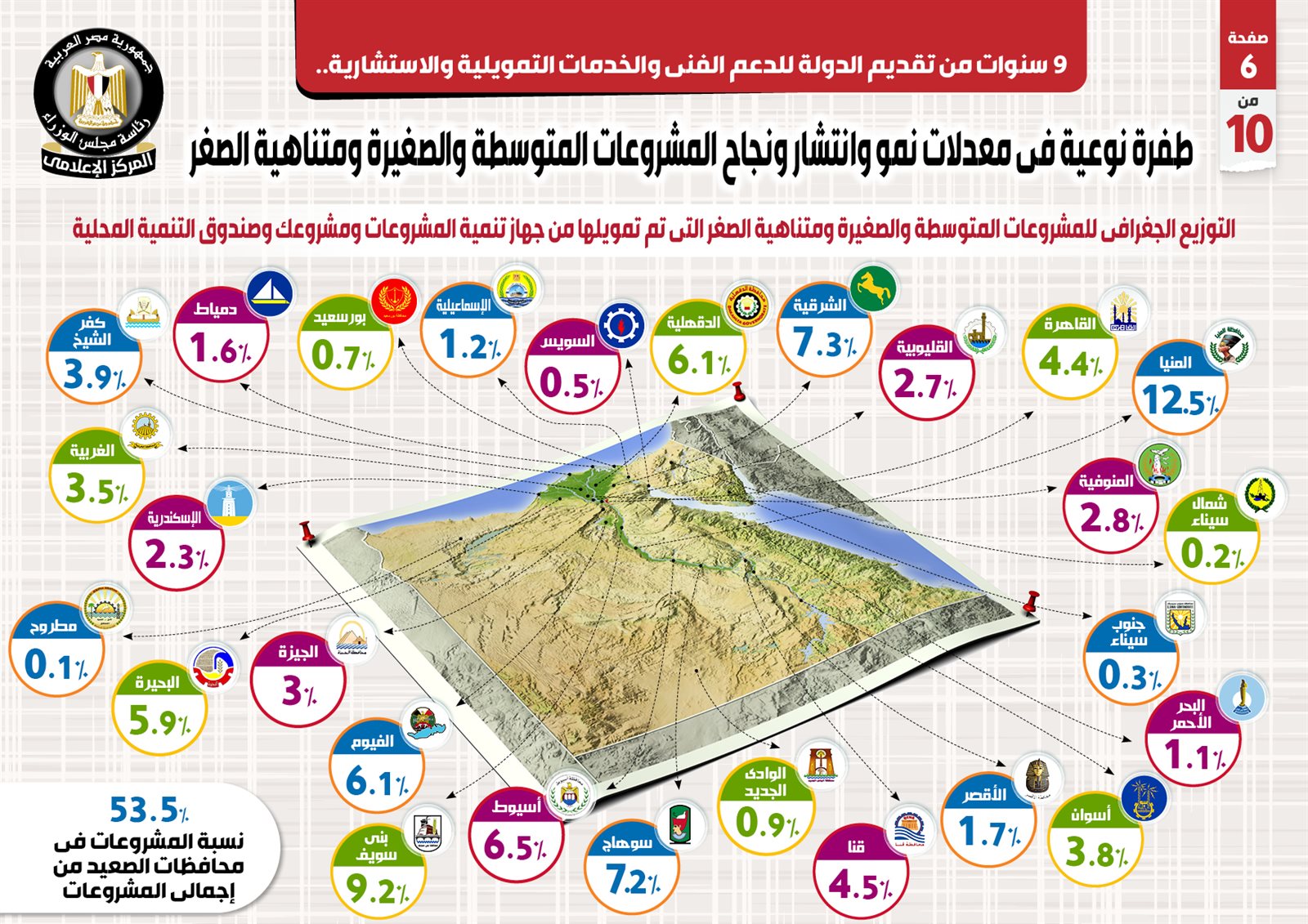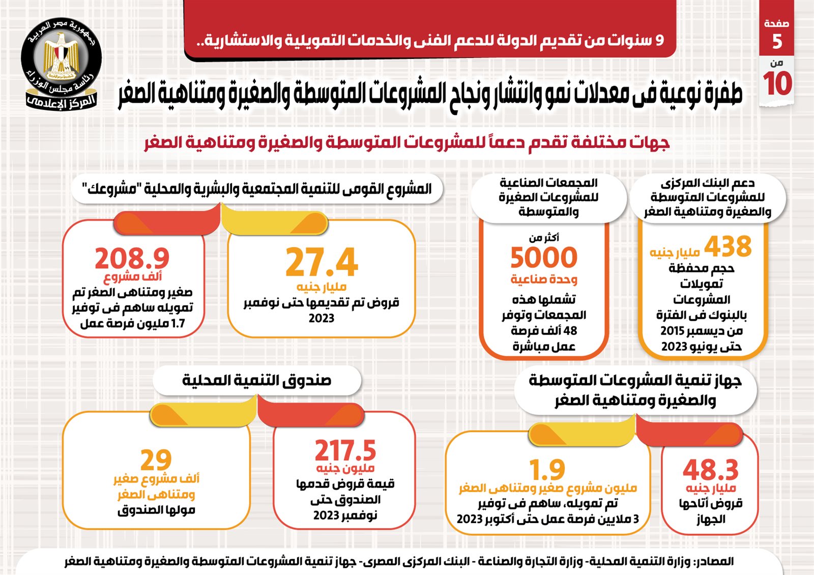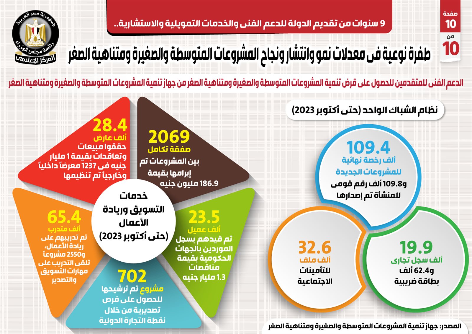 وفي هذا الصدد نشر المركز الإعلامي لمجلس الوزراء تقريرًا تضمن إنفوجرافات تسلط الضوء على الطفرة النوعية في معدلات نمو وانتشار ونجاح المشروعات المتوسطة والصغيرة ومتناهية الصغر على مدار 9 سنوات من تقديم الدولة للدعم الفني والخدمات التمويلية والاستشارية.