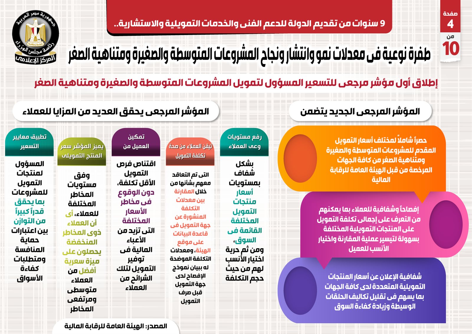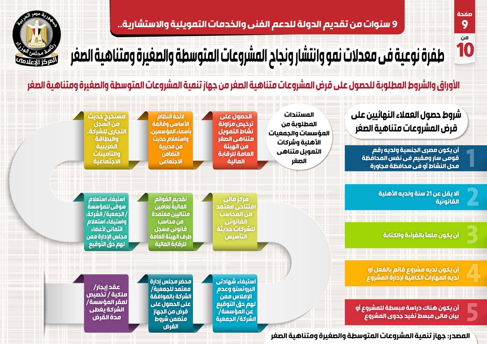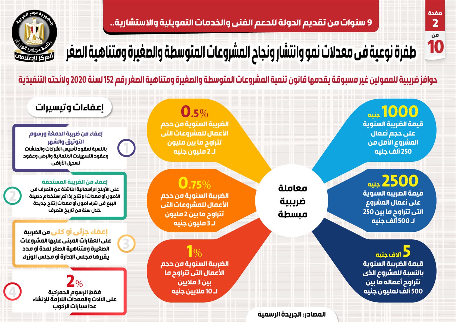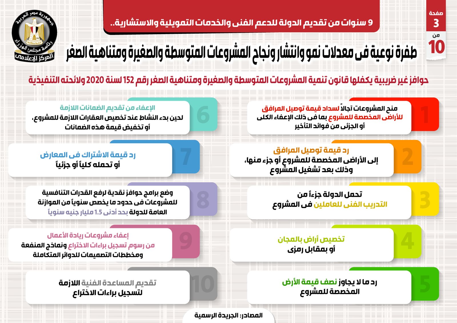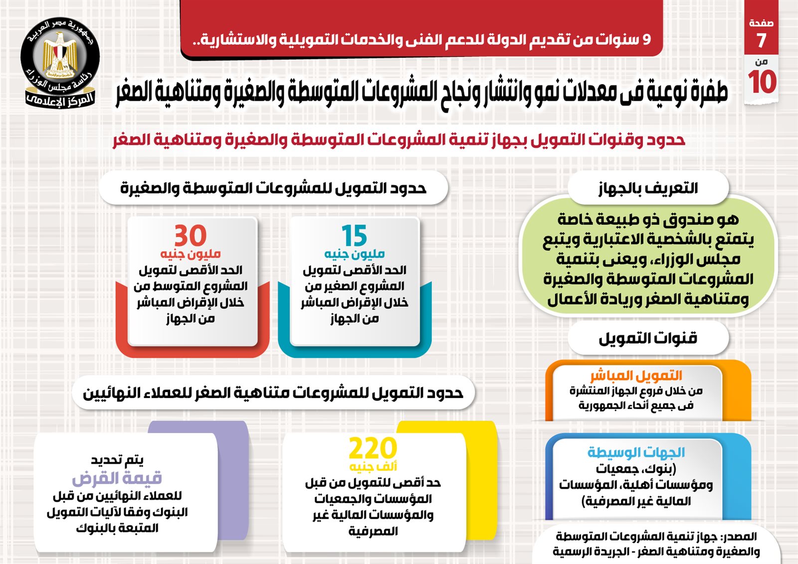 وفي هذا الصدد نشر المركز الإعلامي لمجلس الوزراء تقريرًا تضمن إنفوجرافات تسلط الضوء على الطفرة النوعية في معدلات نمو وانتشار ونجاح المشروعات المتوسطة والصغيرة ومتناهية الصغر على مدار 9 سنوات من تقديم الدولة للدعم الفني والخدمات التمويلية والاستشارية.