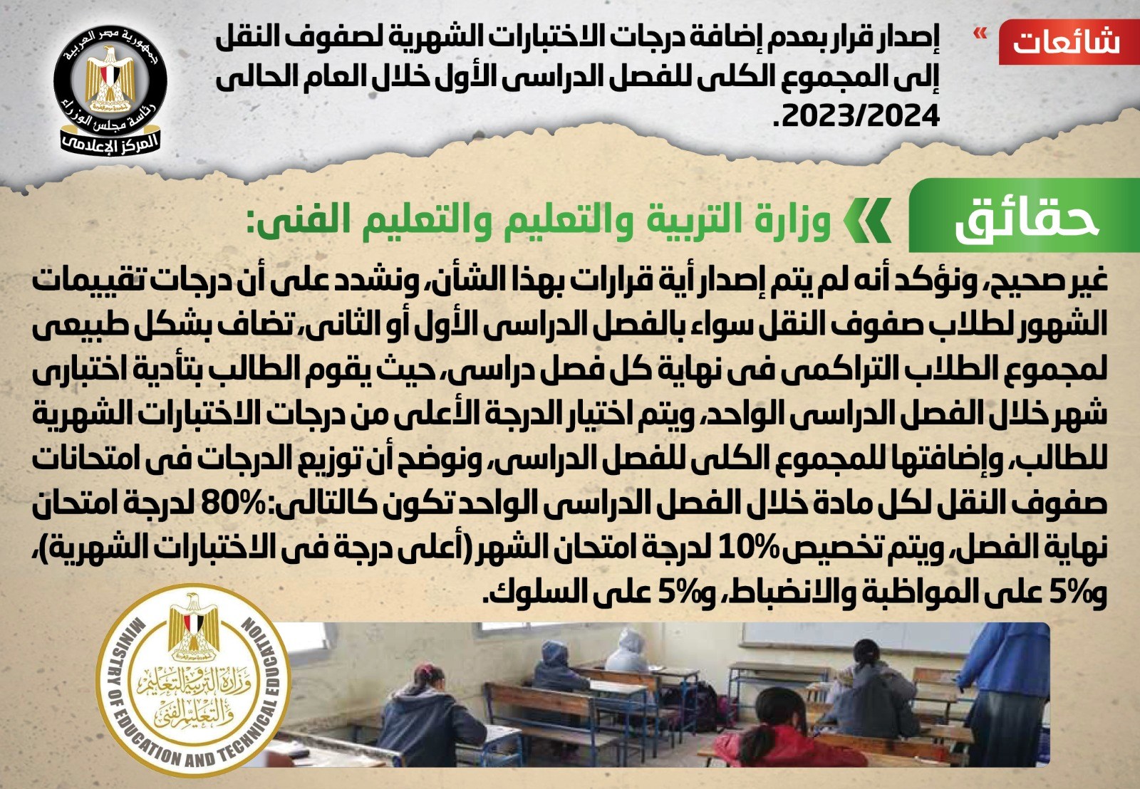 نفى المركز الإعلامي لمجلس الوزراء ما نشر من أنباء بشأن إصدار قرار بعدم إضافة درجات الاختبارات الشهرية لصفوف النقل إلى المجموع الكلي للفصل الدراسي الأول خلال العام الحالي 2023/2024.