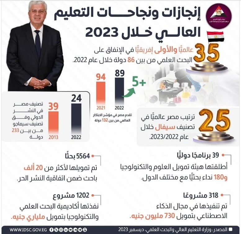 وأشار إلى أنه من أبرز هذه الإنجازات: تقدم مصر 10 مراكز في مؤشر الابتكار العالمي، حيث جاءت في المرتبة 89 من بين 132 دولة، مقارنة بالمركز 99 في 2022 والمركز 108 في 2013، كما جاءت في المركز 35 عالميًا والأولى إفريقيًا في الإنفاق على البحث العلمي من بين 86 دولة خلال عام 2022.