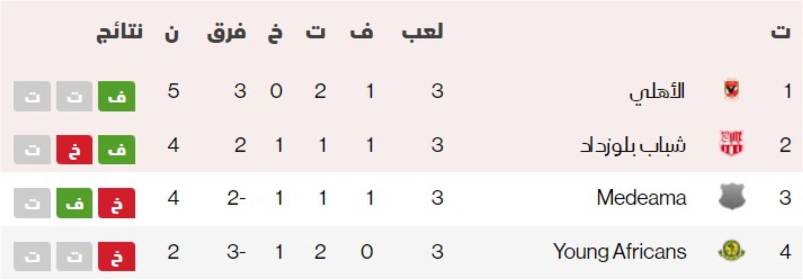ورغم التعادل، حافظ الأهلي على صدارة المجموعة بعدما رفع رصيده إلى 5 نقاط مقابل 4 للفريق الجزائري، ويأتي ميدياما الغاني ثالثاً بـ4 نقاط أيضاً، ويتذيل يانج أفريكانز الترتيب برصيد نقطتين.