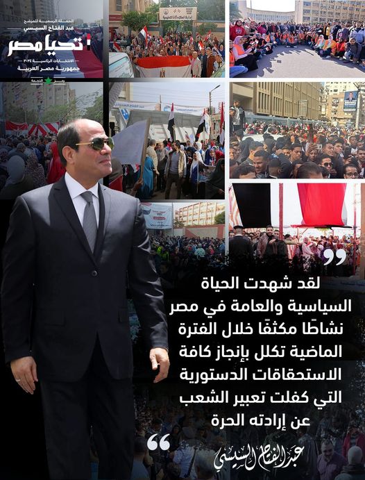 أكد المرشح الرئاسي عبدالفتاح السيسي، أن الحياة السياسية والعامة في مصر شهدت نشاطًا مكثفًا خلال الفترة الماضية، تكلل بإنجاز كافة الاستحقاقات الدستورية، التي كفلت تعبير الشعب عن إرادته الحرة.