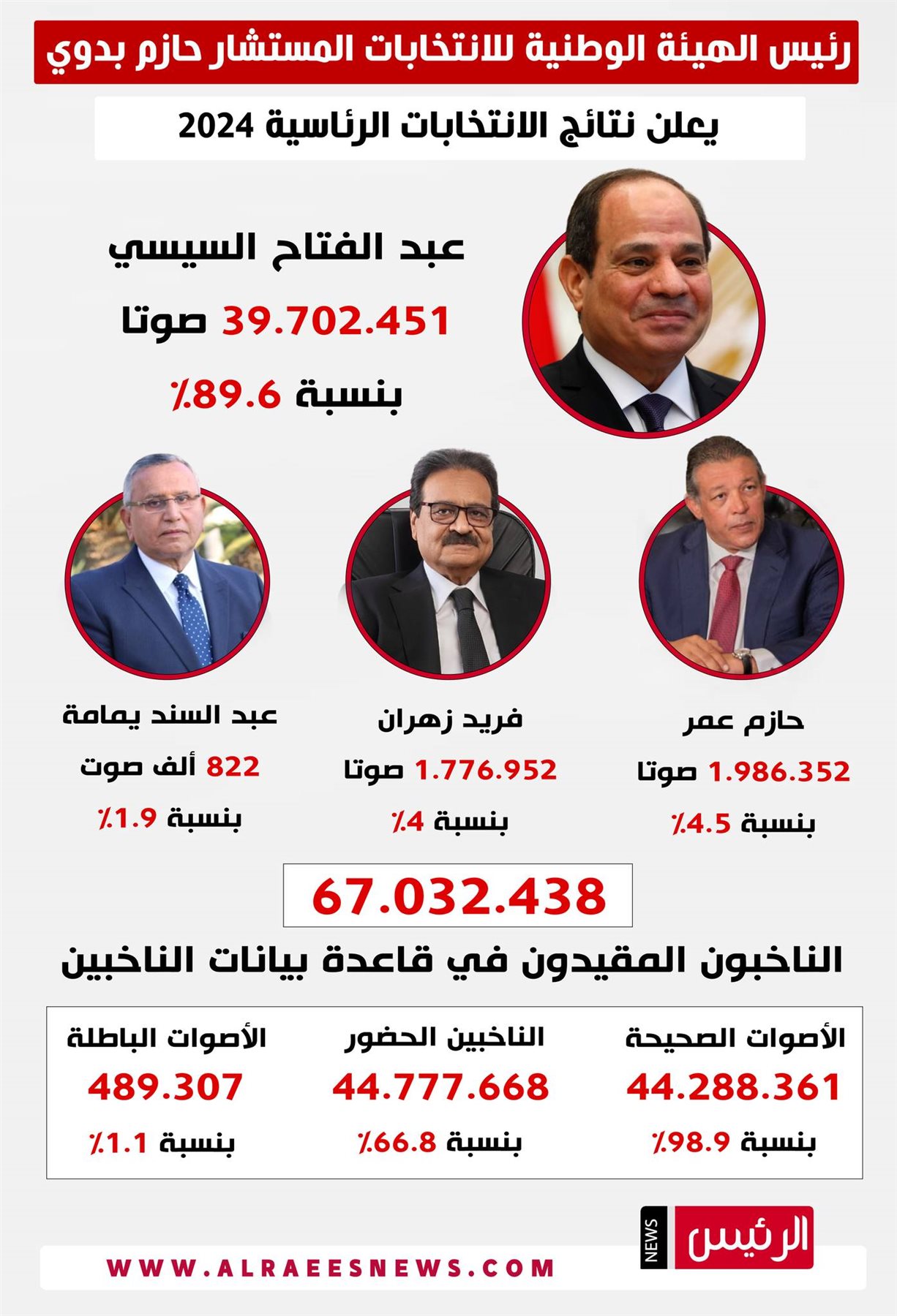أعلن رئيس الهيئة الوطنية للانتخابات المستشار حازم بدوي فوز الرئيس عبدالفتاح السيسي بفترة رئاسية جديدة حيث حصل على نسبة 89.6% بإجمالي أصوات 39 مليونًا و702 ألف و451 صوتًا من إجمالي الأصوات الصحيحة.