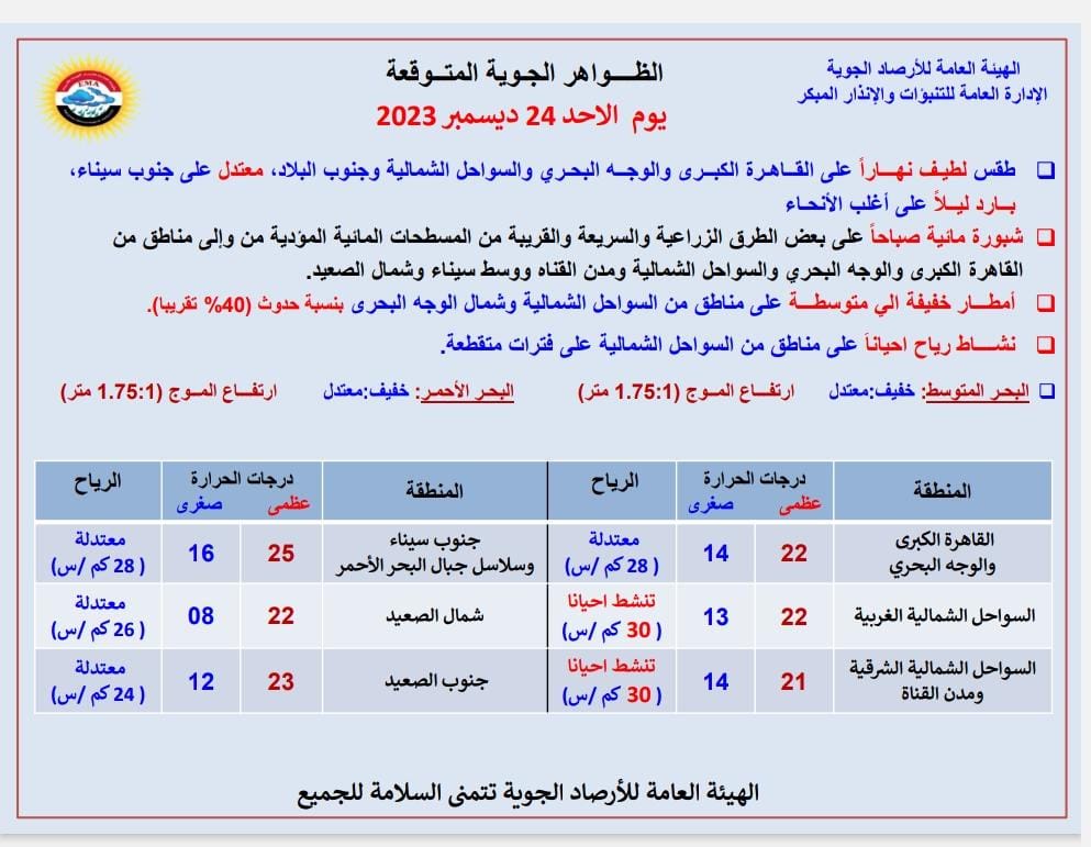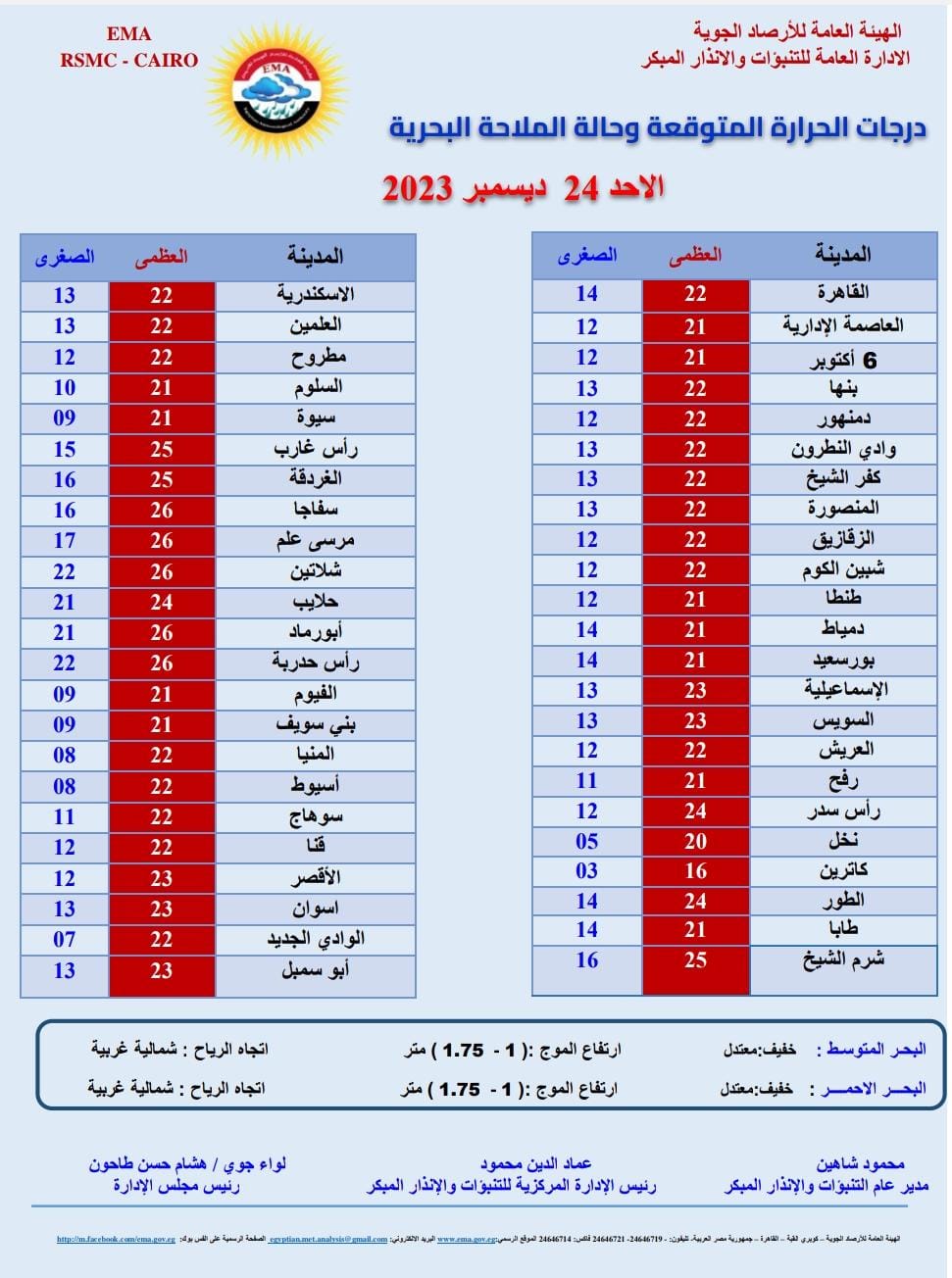 درجات الحرارة المتوقعة اليوم الأحد 24-12-2023