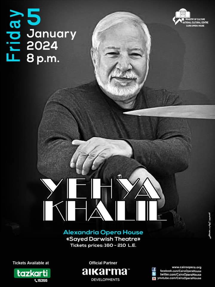 يفتتح الموسيقار يحيى خليل العام الجديد بحفلين في الإسكندرية والقاهرة، حيث يحيي حفله الأول في اوبرا الإسكندرية في الثامنة من مساء يوم الجمعة الموافق ٥ يناير المقبل، يليه حفل في دار الأوبرا المصرية بالقاهرة وذلك يوم الخميس الموافق ١٨ يناير 2024.