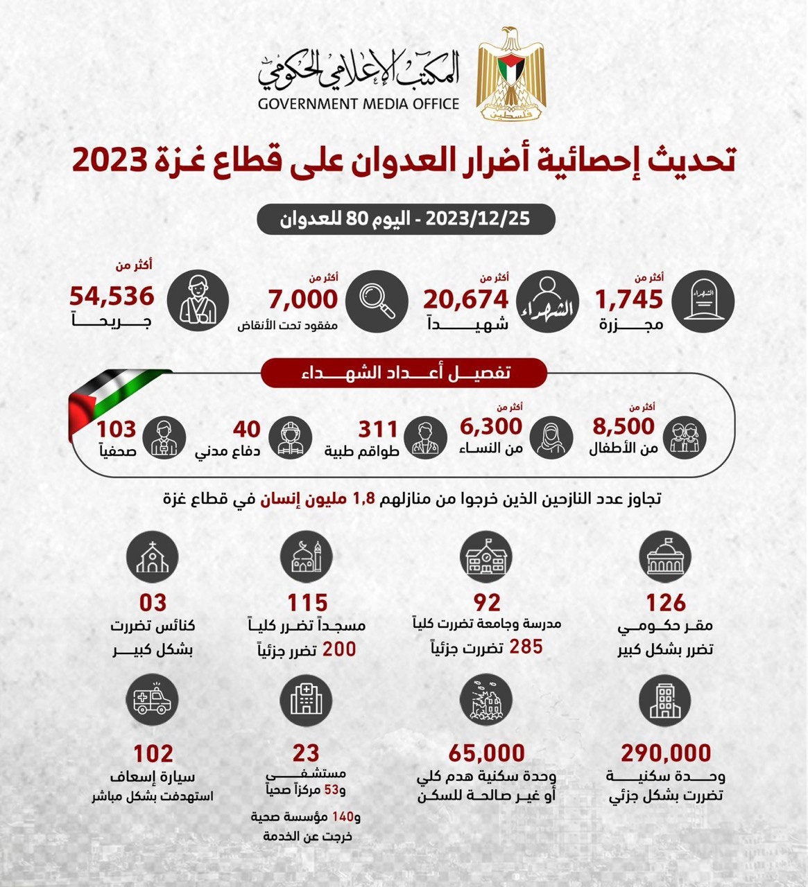 أعلن المكتب الإعلامي لحكومة غزة، ارتفاع عدد ضحايا الحرب الإسرائيلية المستمرة على القطاع منذ 7 أكتوبر، إلى 20 ألفًا و674 شخصًا لقوا حتفهم، في أكثر من 1745 "مجزرة"، فضلًا عن أكثر من 7 آلاف شخص مفقودين تحت الأنقاض، و54 ألفًا و536 جريحًا، فيما تجاوز عدد النازحين الذين خرجوا من منازلهم 1.8 مليون.