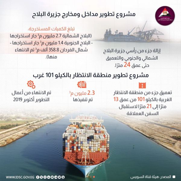 - تعميق جزء من منطقة الانتظار الغربية بالكيلو 101 من عمق 13 مترًا إلى 21 مترًا لاستقبال السفن العملاقة.