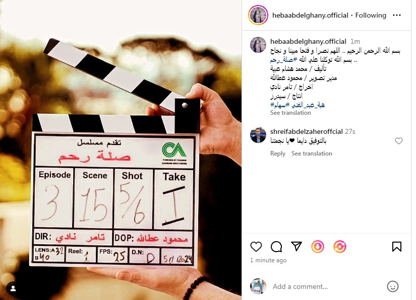 ونشرت هبة عبدالغني صورة كلاكيت تصوير العمل، وعلقت عليها، قائلة: “اللهم نصرا وفتحا مبينا ونجاح.. بسم الله توكلنا على الله صلة رحم، تأليف محمد هشام عبية، ومدير تصوير محمود عطاالله، اخراج تامر نادي، انتاج سيدرز”.