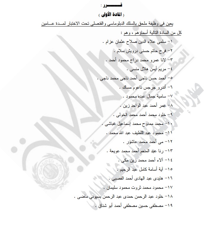 التنفيذية للقانون رقم (69) بتعديل بعض أحكام قانون نظام السلك الدبلوماسي والقنصلى الصادر بالقانون رقم 45 لسنة 1982 والقرارات المعدلة له، تقرر تعين 51 شخص في وظيفة ملحق بالسلك الدبلوماسي والقنصلي تحت الاختبار لمدة عامين.