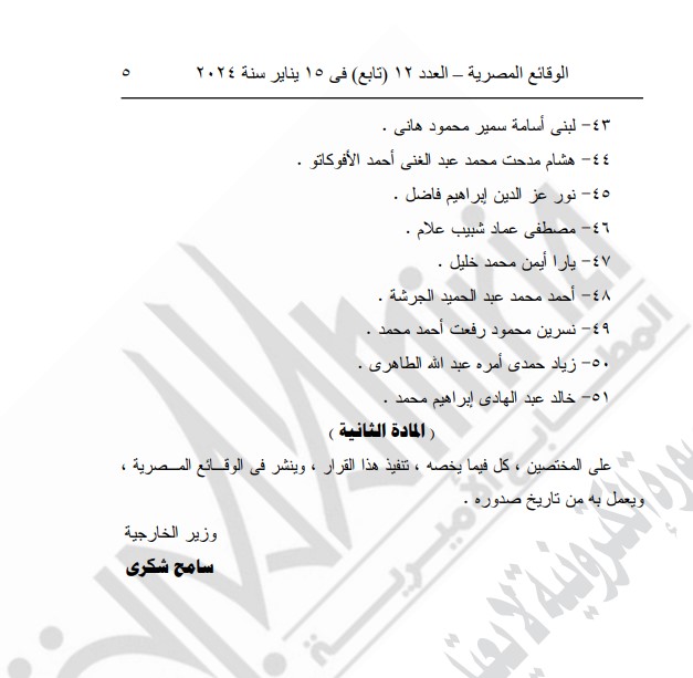 وأوضحت الجريدة الرسمية أن وزير الخارجية سامح شكري، أوضح في القرار رقم 80 لسنة 2024، أنه بعد الاطلاع على قانون نظام السلك الدبلوماسي والقنصلى الصادر بالقانون 45 لسنة 1982 وتعديلاته؛ وعلى لائحة شروط الخدمة بوزارة الخارجية الصادرة بقرار رئيس الجمهورية رقم 146 لسنة 1958؛ وعلى قرار وزير الخارجية رقم 4014 لسنة 2009 الخاص بإصدار اللائحة