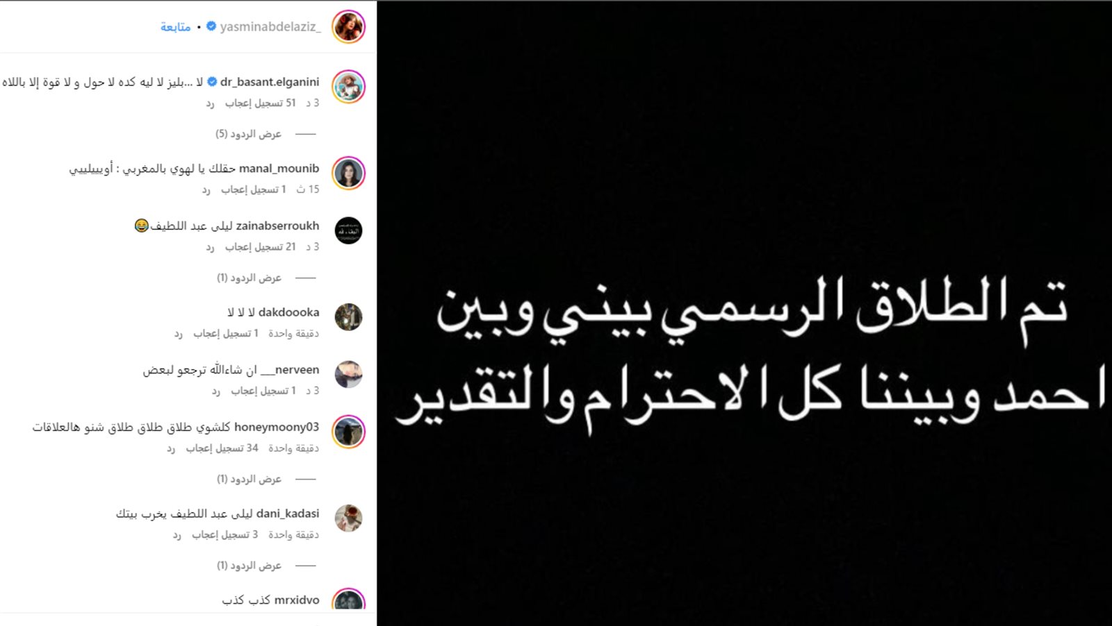 وكتبت ياسمين عبد العزيز عبر حسابها الرسمي على موقع تبادل الصور “إنستجرام” قائلة: "تم الطلاق الرسمي بيني وبين أحمد، وبيننا كل الاحترام والتقدير".