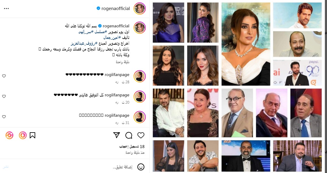 ونشرت روجينا عبر حسابها الرسمي بموقع تبادل الصور والفيديوهات الشهير"انستجرام"، صور جميع أبطال العمل المقرر عرضه خلال موسم رمضان المقبل 2024، وعلقت عليها، قائلا:" القائمة الكامل لأبطال مسلسل "سر إلهي" رمضان 2024.