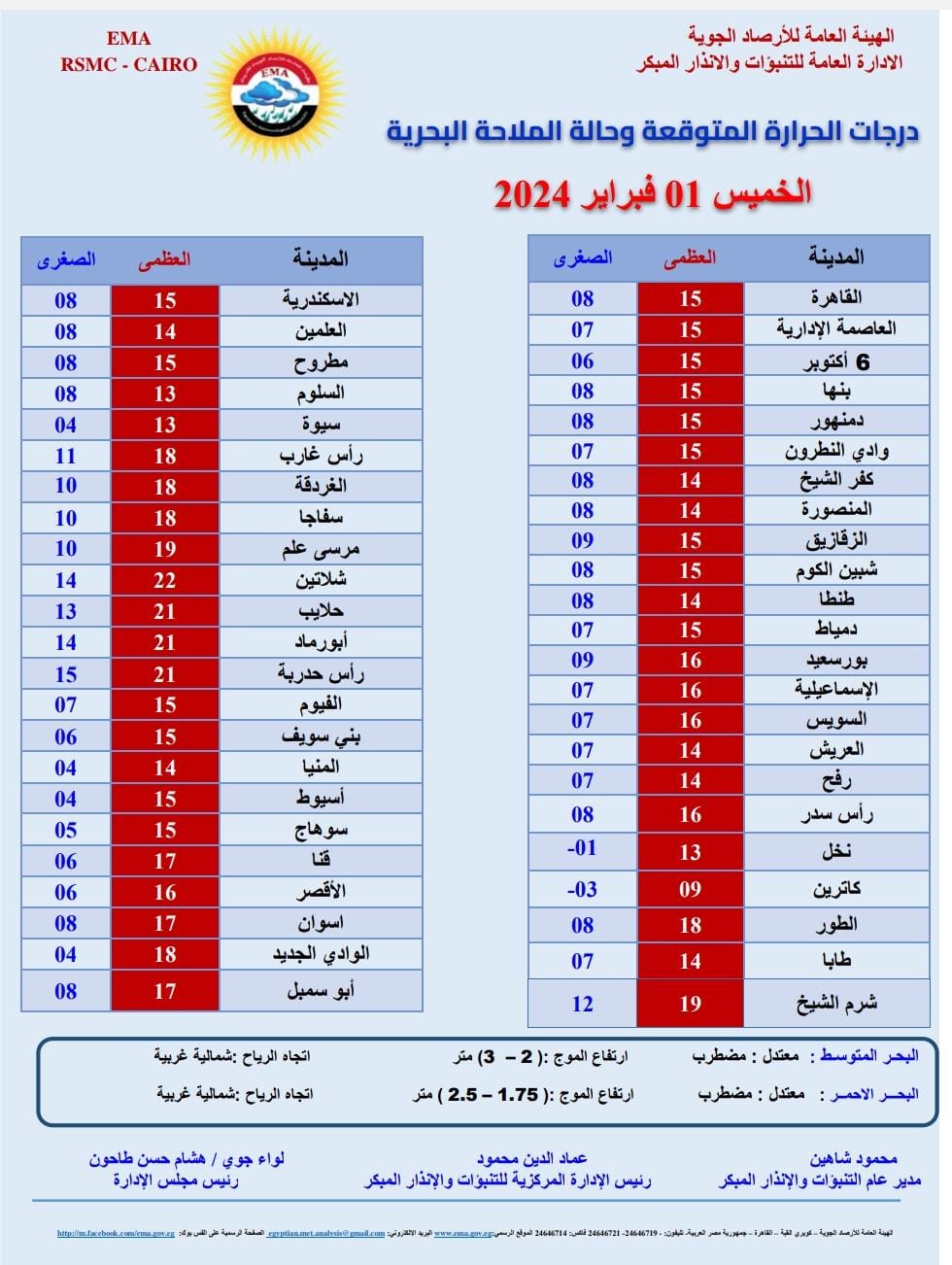 قالت الهيئة العامة للأرصاد الجوية "تشهد البلاد طقسًا باردًا خلال ساعات النهار على القاهرة الكبرى والوجه البحري والسواحل الشمالية، ومائلًا للدفء على شمال الصعيد، ومائلًا للبرودة على سيناء وجنوب الصعيد، وشديد البرودة على جميع أنحاء البلاد ليلا وفي ساعات الصباح الباكر، ويتكون الصقيع على المزروعات في وسط سيناء ومحافظة الوادي الجديد وشمال الصعيد".