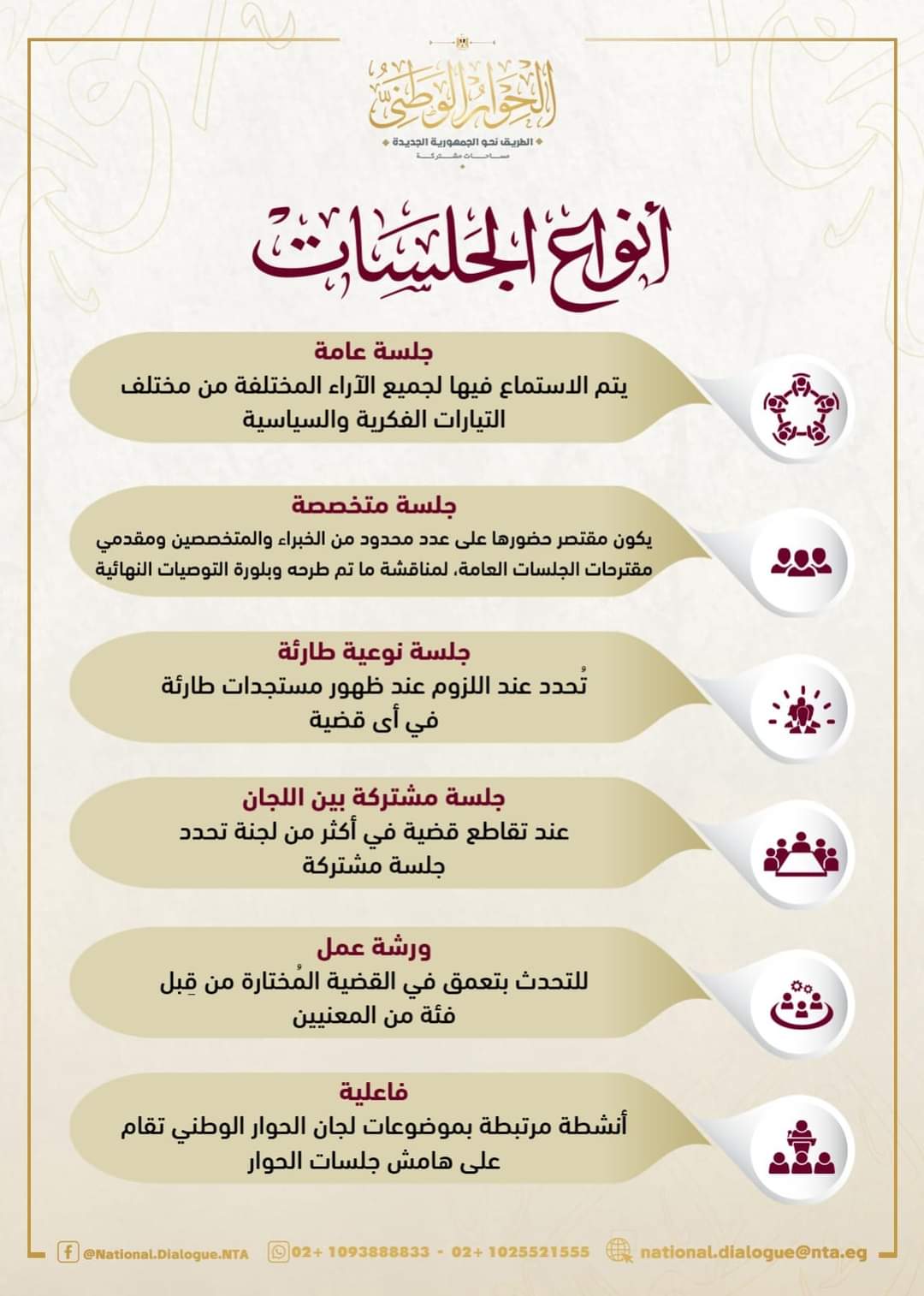 أكدت إدارة الحوار الوطنى، أن جلسات الحوار الوطني متنوعة بين العامة والمتخصصة والنوعية، كما يعقد أيضا ورش عمل وفعاليات وجلسات مشتركة بين لجانه.