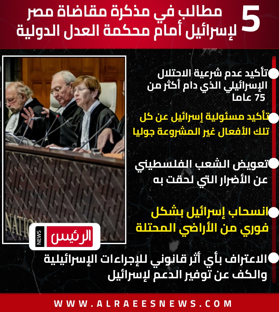 وفي السياق نستعرض 5 مطالب في مذكرة مقاضاة مصر لإسرائيل أمام محكمة العدل الدولية وهي كالآتي:
