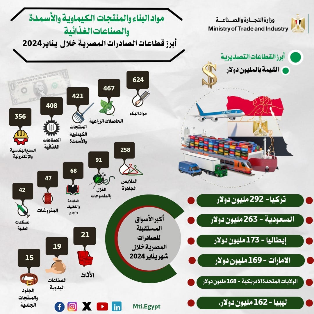 جاء ذلك في سياق أحدث تقرير تلقاه الوزير من الهيئة العامة للرقابة على الصادرات والواردات حول حركة التجارة الخارجية لمصر خلال شهر يناير 2024.
