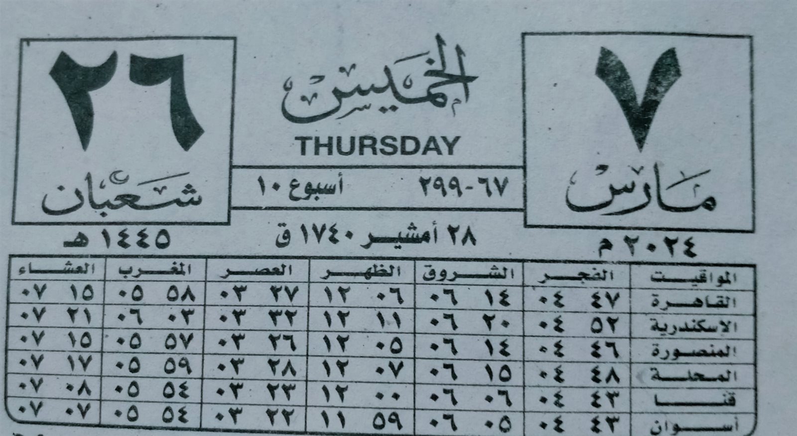 يصادف 7 مارس 2024م، في التقويم الميلادي.
