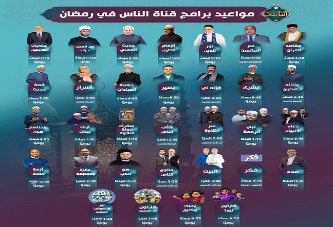 وتشمل خارطة البرامج المذاعة عبر شاشة قناة الناس خلال شهر رمضان 2024، الـ30 يومًا، على 28 برنامجًا متنوعًا ما بين الدعوة والفتوى وتفسير القرآن وشرح السُّنّة والنقاش العلمي والتلاوة ونقل الشعائر من المساجد الكبرى من داخل مصر وخارجها.