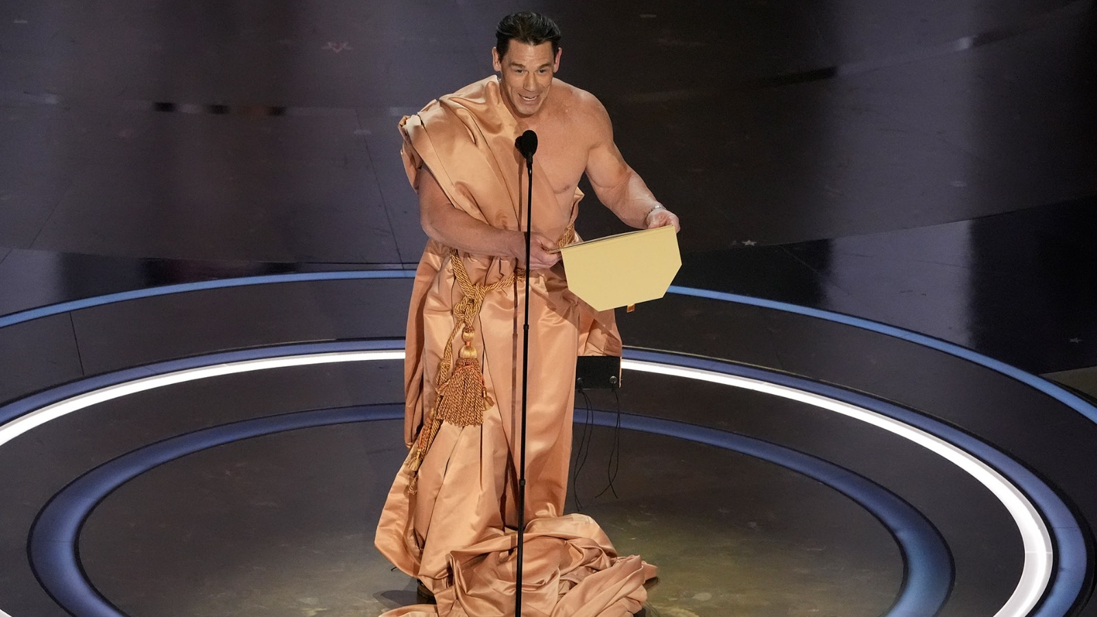 ظهر الممثل ونجم المصارعة الحرة، الأمريكي جون سينا، على خشبة مسرح حفل توزيع جوائز الأوسكار الأحد، أثناء البث التلفزيوني لتقديم جائزة أفضل تصميم أزياء، عاريا بشكل شبه كامل.
