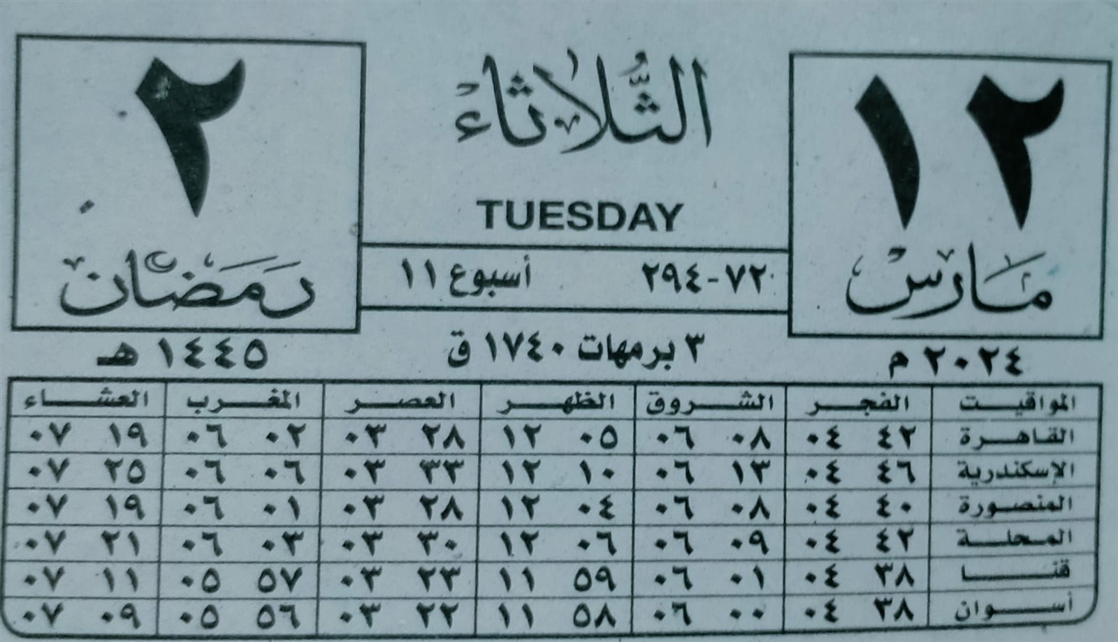 يوم الثلاثاء 12 مارس يوافق 2 رمضان.