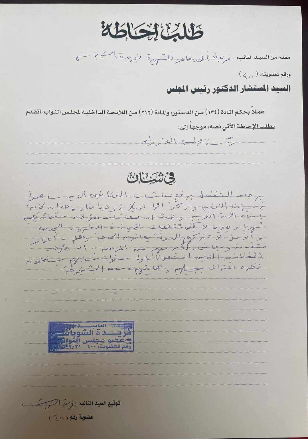 تقدمت النائبة فريدة الشوباشي، عضو مجلس النواب، بطلب إحاطة إلى رئيس مجلس النواب موجه إلى رئيس الوزراء بشأن رفع معاشات الفنانين.