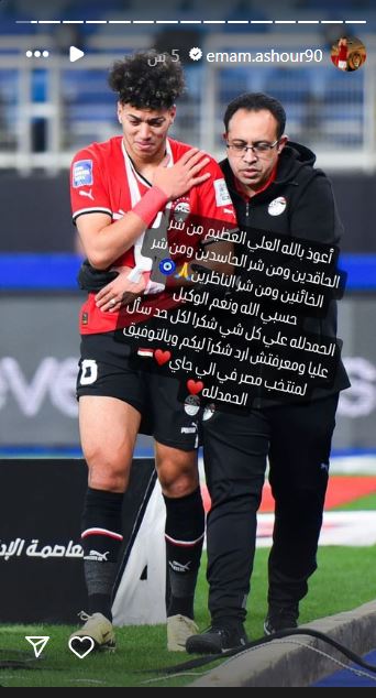 ونشر إمام صورته عبر خاصية "القصص القصيرة" على حسابه الرسمي عبر موقع "إنستجرام"، وكتب: "أعوذ بالله العلي العظيم من شر الحاقدين، ومن شر الحاسدين ومن شر الخائنين ومن شر الناظرين، حسبي الله ونعم الوكيل، الحمد لله على كل شيء، وشكرًا لكل حد سأل عليا ومعرفتش أرد، شكرًا ليكم وبالتوفيق لمنتخب مصر في اللي جاي، والحمد لله".