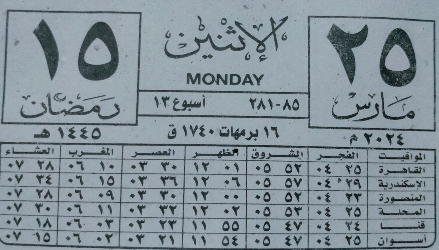 يوافق اليوم الانين 15 رمضان 1445 ه، في التقويم الهجري.