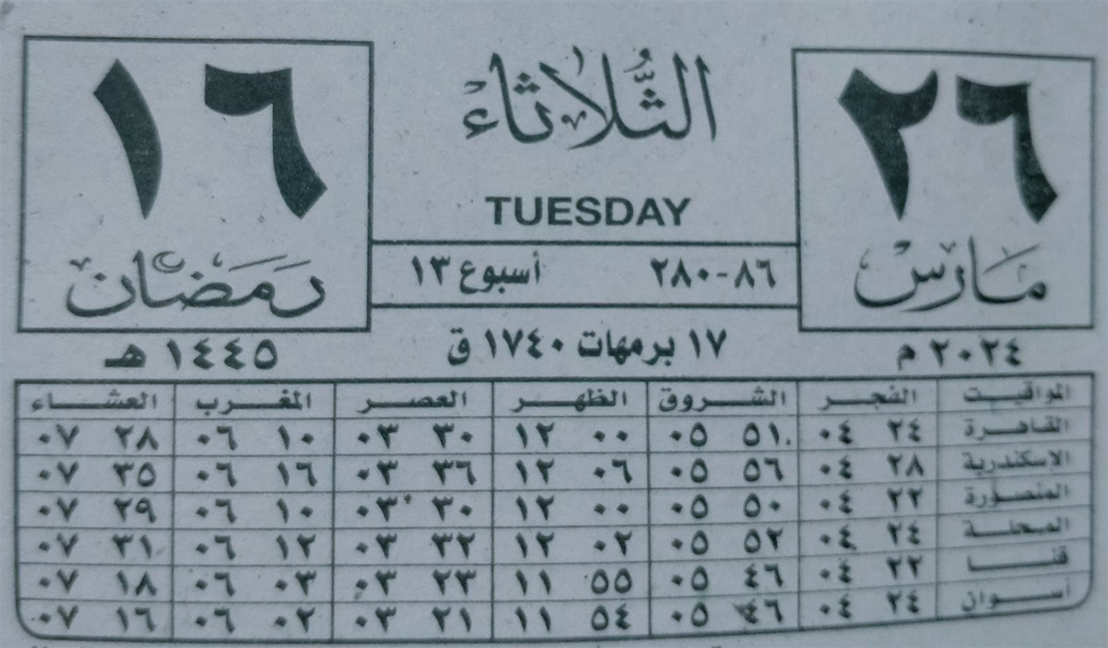 يوافق اليوم الثلاثاء 16 رمضان 1445 ه، في التقويم الهجري.