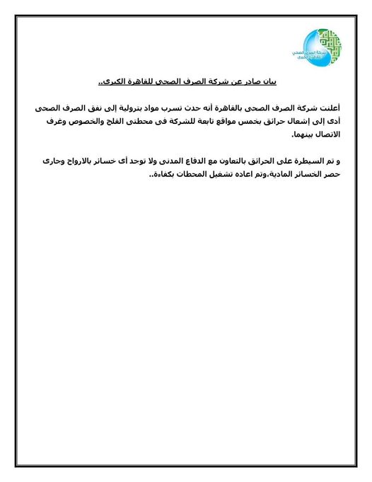 أعلنت شركة الصرف الصحي بالقاهرة، أن تسرب مواد بترولية إلى نفق الصرف الصحي أدى إلى إشعال حرائق بـ 5 مواقع تابعة للشركة في محطتى القلج والخصوص وغرف الاتصال بينهما.