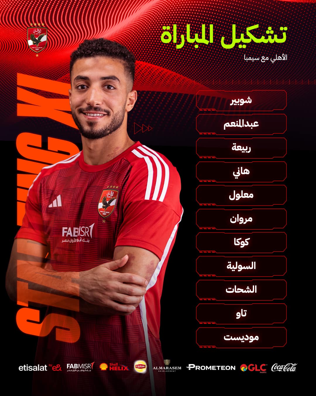 ويضم تشكيل الأهلي كلًا من: مصطفى شوبير، محمد عبد المنعم، رامي ربيعة، محمد هاني، علي معلول، مروان عطية، عمرو السولية، أحمد نبيل كوكا، حسين الشحات، بيرسي تاو وموديست.