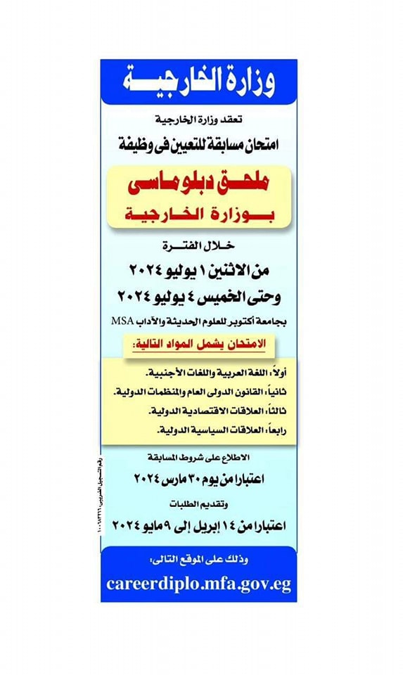 وقالت وزارة الخارجية في إعلان لها إن الاختبار يشمل اللغة الغربية واللغات الأجنبية، القانون الدولي العام والمنظمات الدولية، العلاقات الاقتصادية الدولية، العلاقات السياسية الدولية، موضحة أن شروط المسابقة سيتم نشرها اعتبارا من 30 مارس الجاري على أن تقدم الطلبات اعتبارا من 14 أبريل إلى 9 مايو المقبل.