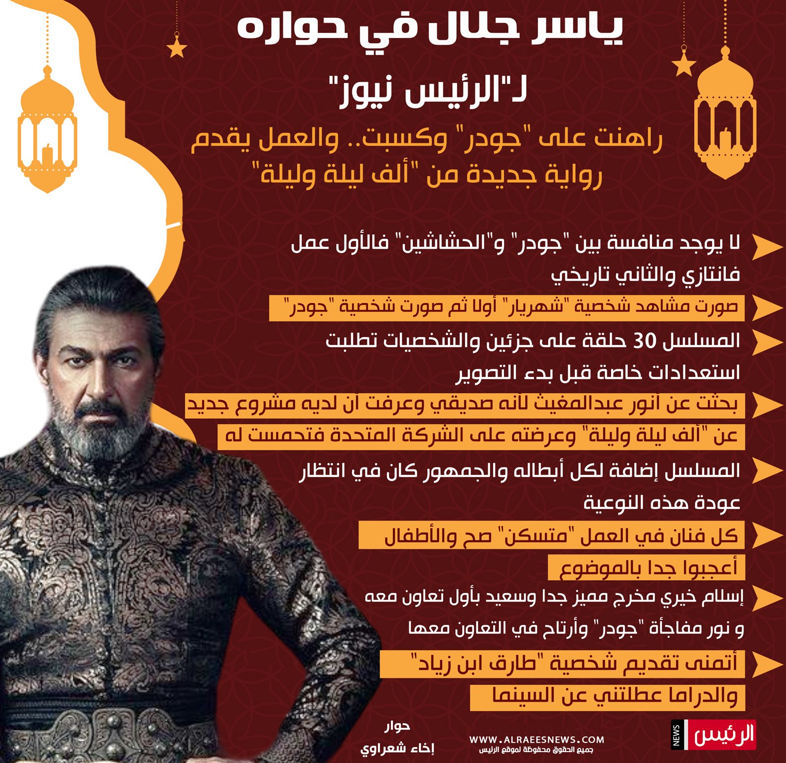 تحدث النجم ياسر جلال في حوار خاص مع "الرئيس نيوز"، حول كواليس الاستعداد لمسلسل "جودر" وتخوفاته من تقديم هذه النوعية من دراما الفانتازيا، وردود الفعل التي تابعها بعد عرض "جودر" مع بداية النصف الثاني من شهر رمضان، ورأيه في المنافسة، وتفاصيل أخرى كثيرة.