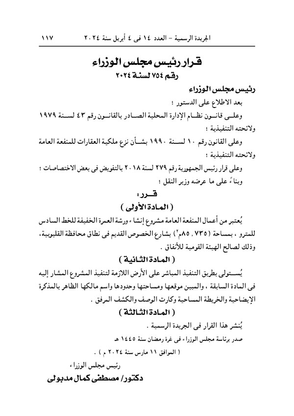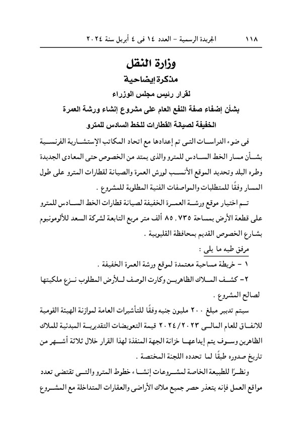 نشرت الجريدة الرسمية قرار رئيس مجلس الوزراء بشأن اعتبار مشروع إنشاء ورشة العمرة الخفيفة للخط السادس للمترو بشارع الخصوص القديم في نطاق محافظة القليوبية، من أعمال المنفعة العامة لصالح الهيئة القومية للأنفاق.