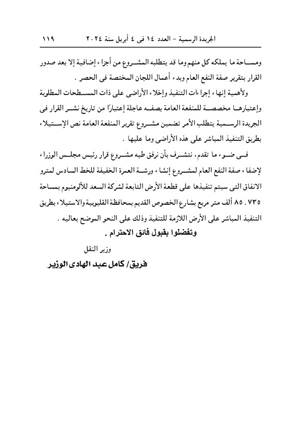 كما تضمن القرار أن يستولى بطريق التنفيذ المباشر على الأرض اللازمة لتنفيذ المشروع المشار إليه.