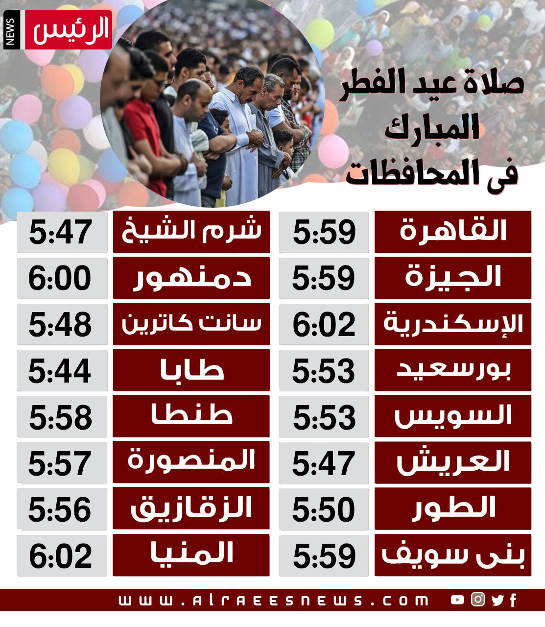 ويستعرض “الرئيس نيوز” في الإنفوجراف التالي مواعيد صلاة عيد الفطر بالمحافظات وهي كالآتي: