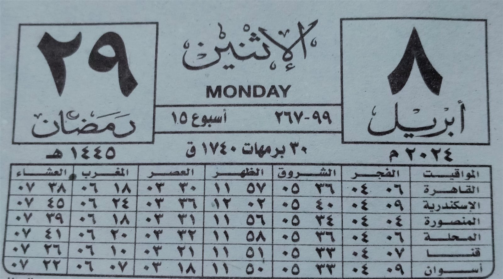 يوافق اليوم الأحد 28 رمضان 1445، في التاريخ الهجري.