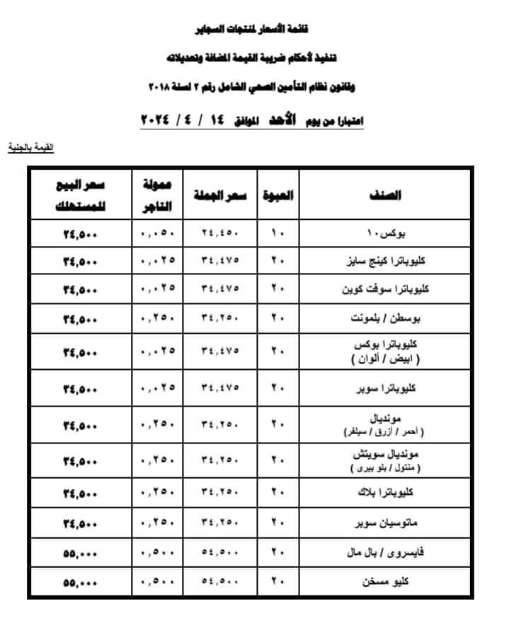 شهدت أسعار منتجات شركتي جلوبال والشرقية للدخان، ارتفاعًا، وذلك تنفيذًا لأحكام ضريبة القيمة المضافة وتعديلاته، وقانون نظام التأمين الصحي الشامل رقم 2 لسنة 2018، وذلك بدءًا من اليوم الأحد.