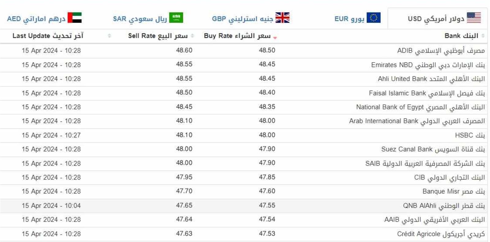 في أكبر بنكين من حيث الأصول والتعاملات، فقد سجل سعر الدولار في البنك الأهلي المصري 47.45 جنيه للشراء، و47.55 جنيه للبيع، وفي بنك مصر سجل الدولار 47.60 جنيه للشراء و47.70 جنيه للبيع.
