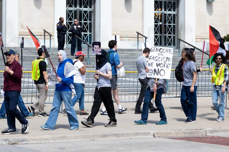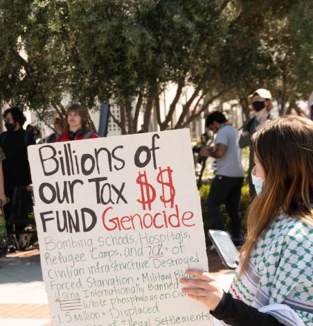 ووقف أكثر من 100 طالب وأفراد من المجتمع المحلي، وهم يرتدون الكوفية الفلسطينية ويلوحون بالأعلام الفلسطينية، في ساحة تومي تروجان بعد ظهر الاثنين كجزء من احتجاج وطني من المقرر أن يتزامن مع يوم الضرائب وتم تنسيق الاحتجاج الوطني من قبل "تحالف الإضراب من أجل غزة Strike4Gaza" الذي يضم أكثر من 20 منظمة مؤيدة لفلسطين في الولايات المتحدة.
