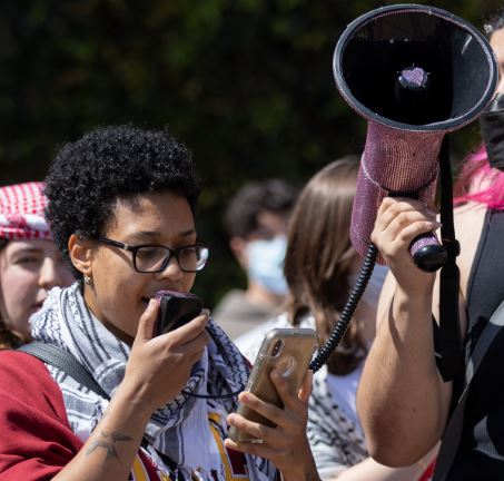 وتحدثت طالبة تدعلا مادلين، وهي طالبة أمريكية من أصل فلسطيني أعربت عن أسفها لأن "العالم يتظاهر بالاهتمام بشعور الطلاب بالأمان في الحرم الجامعي ما لم يتعلق الأمر بالطلاب الفلسطينيين، والطلاب العرب، والطلاب المسلمين أو أي شخص لديه الشجاعة الكافية للمطالبة بالعدالة من أجل فلسطين"، وانتقدت المناخ السائد الذي يعتبر أنه ليس من حق الطالب أن يناضل من أجل تحرير فلسطين ثم وقف المنظمون دقيقة صمت، تكريما لأكثر من 33 ألف فلسطيني استشهدوا في الهجمات الإسرائيلية منذ 7 أكتوبر، ويشكل النساء والأطفال ثلثي الشهداء.