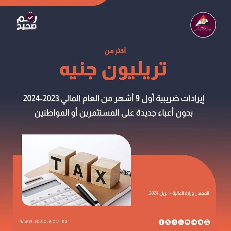 وبين وفق ما نشره مركز معلومات مجلس الوزراء، أن تحقيق إيرادات ضريبية تجاوزت تريليون جنيه بمعدل نمو 41.2%، بدون أي أعباء إضافية على المواطنين أو المستثمرين من خلال ميكنة المنظومة الضريبية ودمج الاقتصاد غير الرسمي في الاقتصاد الرسمي.