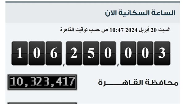 أعلنت الساعة السكانية الموجودة أعلى مبنى الجهاز المركزي للتعبئة العامة والإحصاء، اليوم السبت، عن وصول عدد سكان مصر بالداخل إلى 106 ملايين و250 ألف نسمة بزيادة قدرها 250 ألف نسمة خلال 72 يوما؛ حيث سجل عدد سكان مصر 106 ملايين نسمة بالداخل في الثامن من فبراير الماضي.